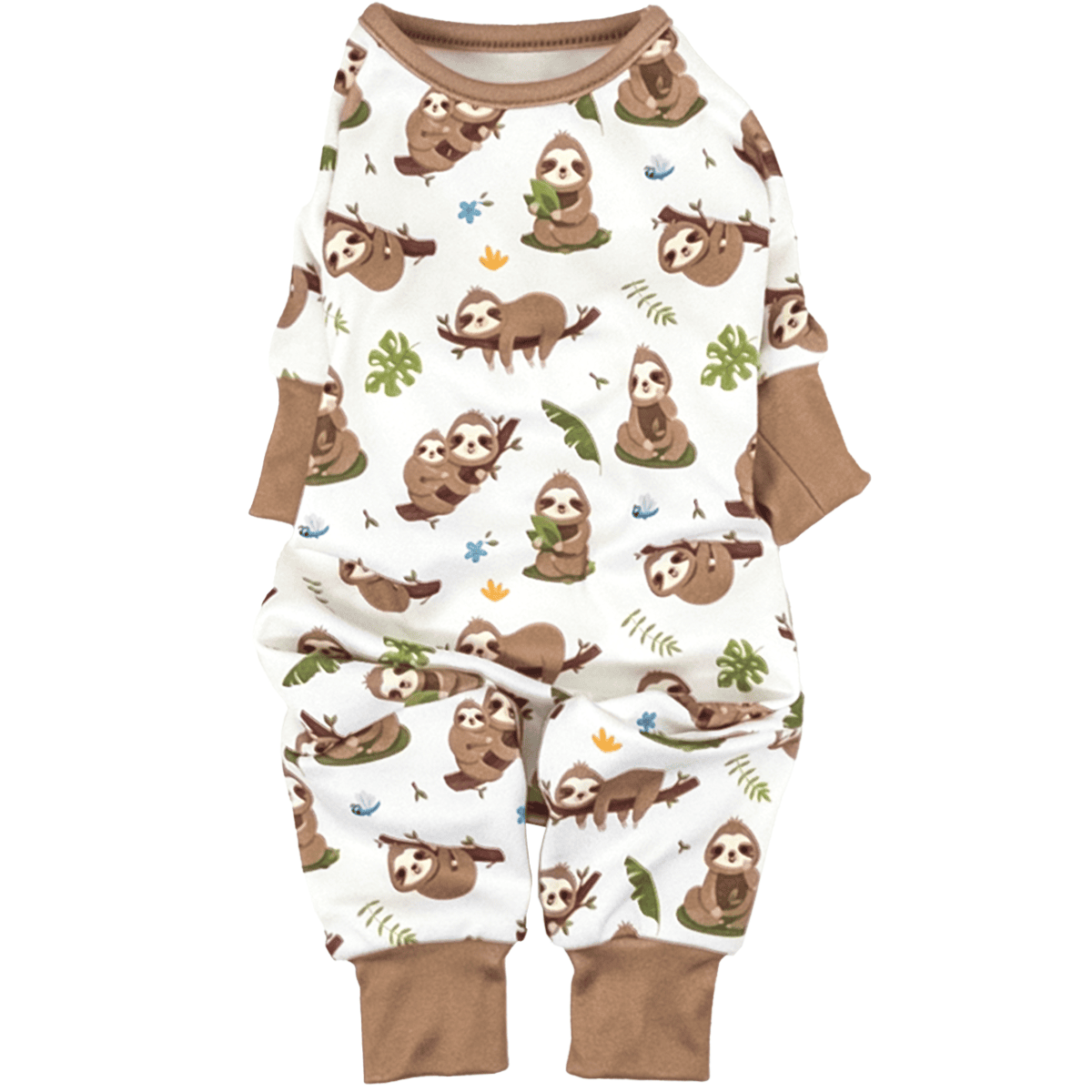 Take it slow and let your dog relax in ultimate comfort with our soft dog pajamas featuring adorable sloth prints. Super soft fabric with brown cuffs, this full-body onesie features a lazy day sloth print and comes in sizes XS to XXL.  Thoughtfully designed with a convenient leash hole, it's perfect for lounging or keeping your pup warm during chilly nights.