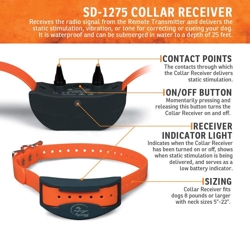 • Collar Receiver fits dogs 8 pounds or larger with neck sizes 5" - 22"