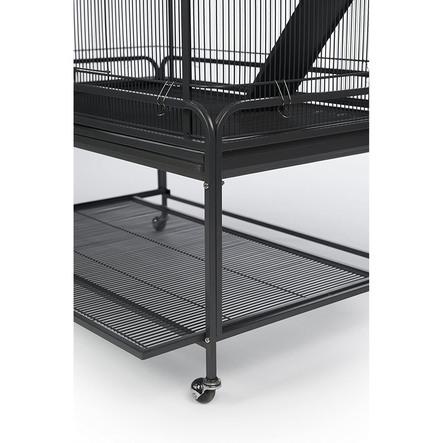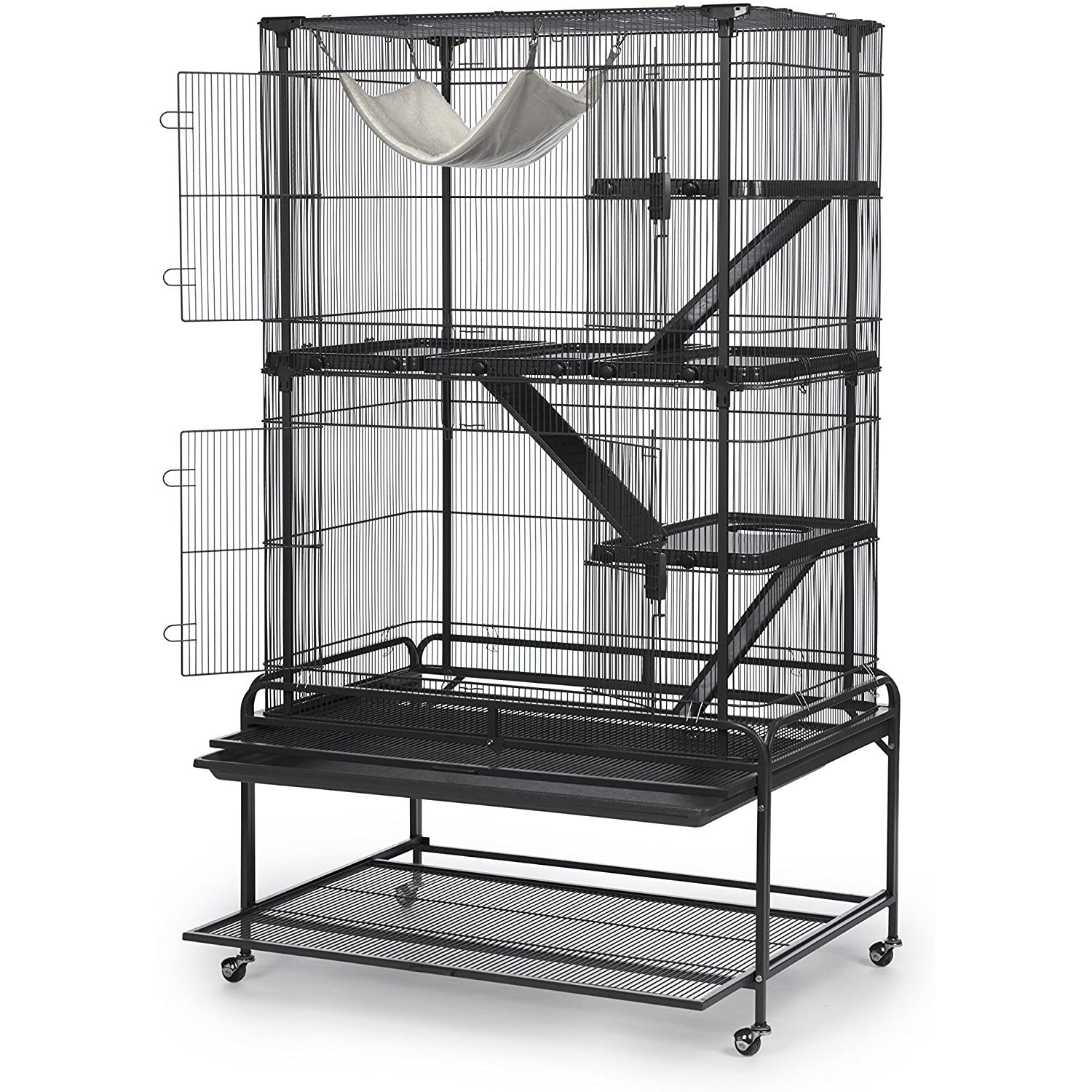 Prevue Pet Products Deluxe Critter Cage 484 is a safe and spacious home for a wide variety of small animals. Exceptional engineering makes our critter cage easy to assemble and provides a paw friendly design – no gaps or pinch points Lightweight, rust-resistant,metal construction is heavy duty with rails, clips and alignment tabs to keep cage parts aligned, strong and sturdy. Cage comes complete with five shelves with twist knob closure, three ramps and a super soft plush hammock. Pet parents can comfortably access the cage interior through two large entry points, cage doors close easily and securely with our simple two-finger locking mechanism. Doors swing open wide providing full interior cage access for interacting with your pet or cleaning. The removable grille and tray make this cage easy to clean and are held in place with a windbell lock. A solid fit into the cage base provides extra stability while metal and hard rubber casters allow you to easily move the cage and lock into place as needed. Use the built in shelf to store extra toys or treats. Expertly engineered in the USA, all Prevue cages undergo independent lab testing to conform to the highest levels of pet safety. Suitable for small animals, ferrets, sugar gliders, rats, chinchillas, hedgehogs, tortoises, lizards, chameleons, iguanas and more, our Deluxe Critter Cage measures 37’’ long, 23 1/8’’ wide and 63 3/8’’ high including the stand with 7/16’’ wire spacing. Replacement platforms and ramps available separately.